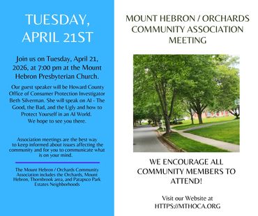 Welcome to the Mount Hebron /Orchards Community Association website. The primary purpose of this site is to provide helpful information to the residents of our community and to promote the benefits to those interested in making our neighborhood their new home. The communities of Mount Hebron, The Orchards, Thornbrook, and Patapsco Park Estates are all represented by the Association. Friendly neighbors, quality homes, top-ranked schools, and a convenient location are just a few of the reasons our community ranks as one of the best in Howard County